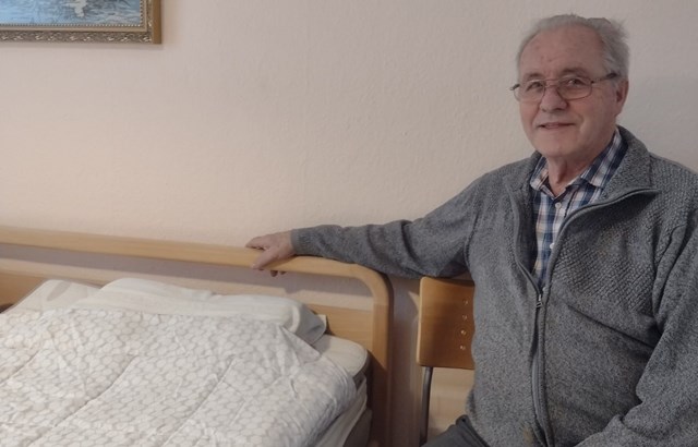 Her ses Knud i sit soveværelse med den brugte Jensen seng, som han købte i butikken. Foto: Kenneth Johansson