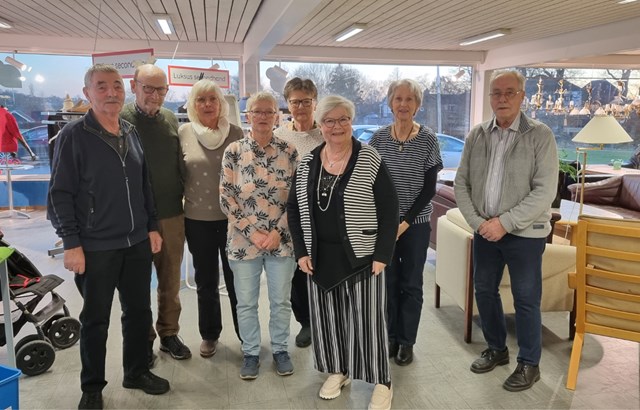 Ud af butikkens i alt 85 frivillige, har 12 været med siden butikkens spæde start. Her ses 8 af dem. Fra venstre Steen, Bitten, Aase, Anni, Birgit, Bente og Knud . Foto: Kenneth Johansson