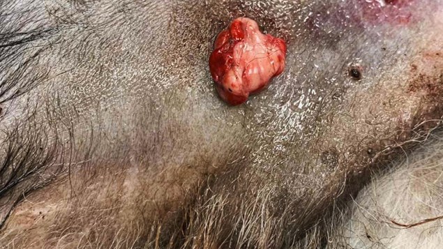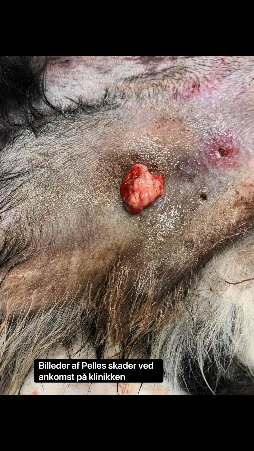 Pelle var blevet overfaldet af en anden hund som havde pådraget ham flere dybe og kraftigt blødende sår. Heldigvis kunne vi hurtigt tage imod dem og påbegynde den nødvendige behandling.